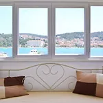 Villa Merica, som ligger ungefär 15 minuters promenad från Den historiska staden Trogir, har en terrass med utsikt över havet.